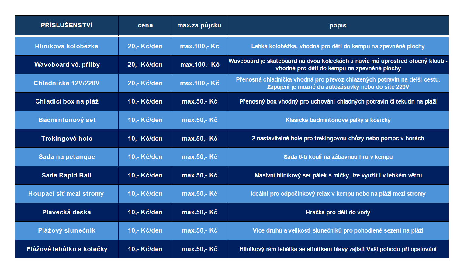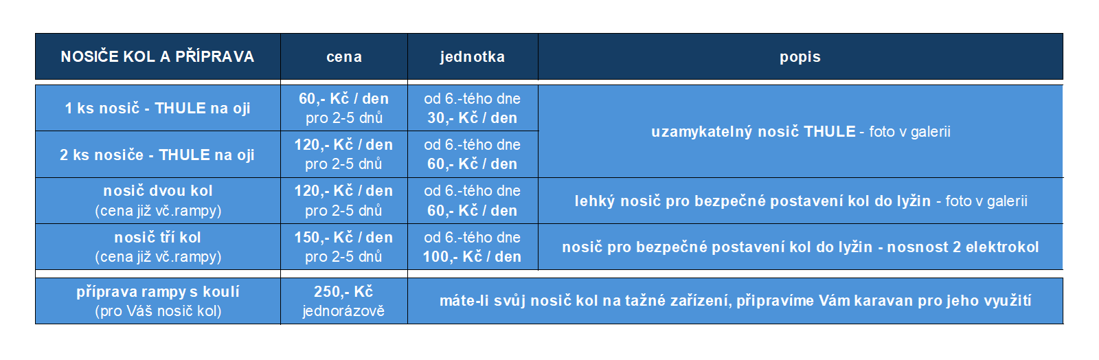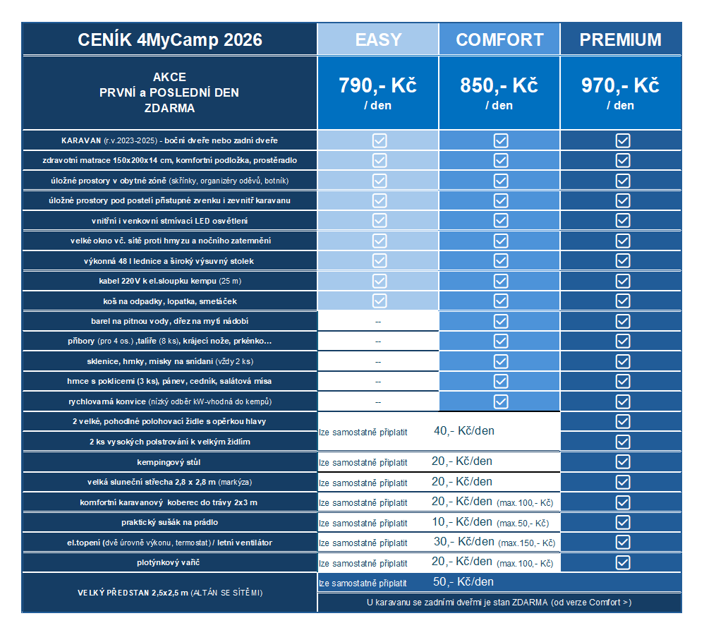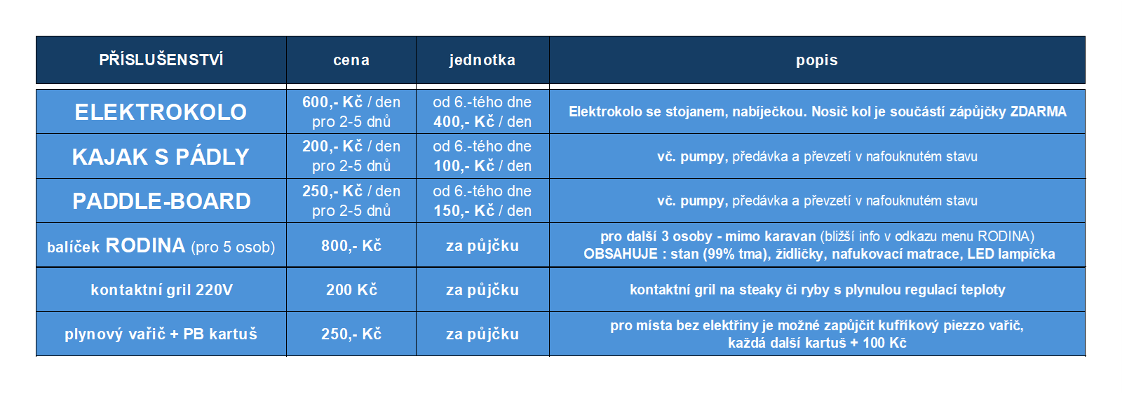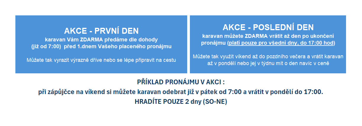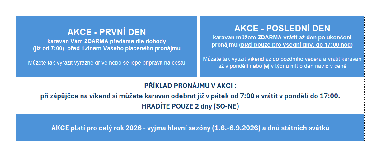 - případné vrácení karavanu stejnou formou je možné po předchozí dohodě na datu, času převzetí a platbou stejné částky, jako za dovoz